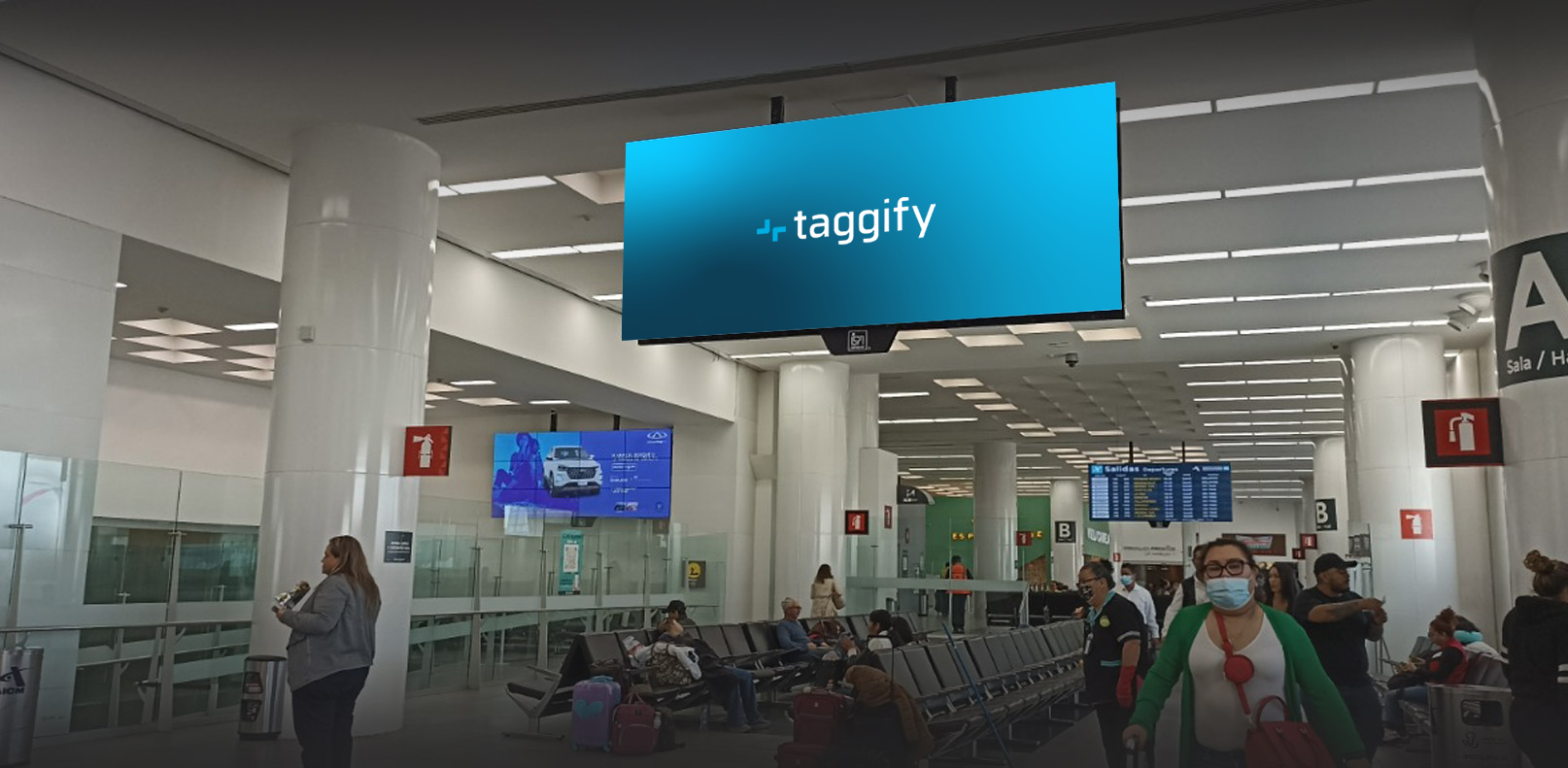 Midscreen ubicado en la Terminal 2 del Aeropuerto Internacional Benito Juarez, CDMX. Este videowall tiene una excelente visibilidad para los pasajeros que entran y salen de la Sala 75.